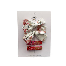 Each clip set is made with the same fabric and prints used for the head wraps and attached to silver alligator clips. All sets comes with two bar clips and one hand tied bow clip.